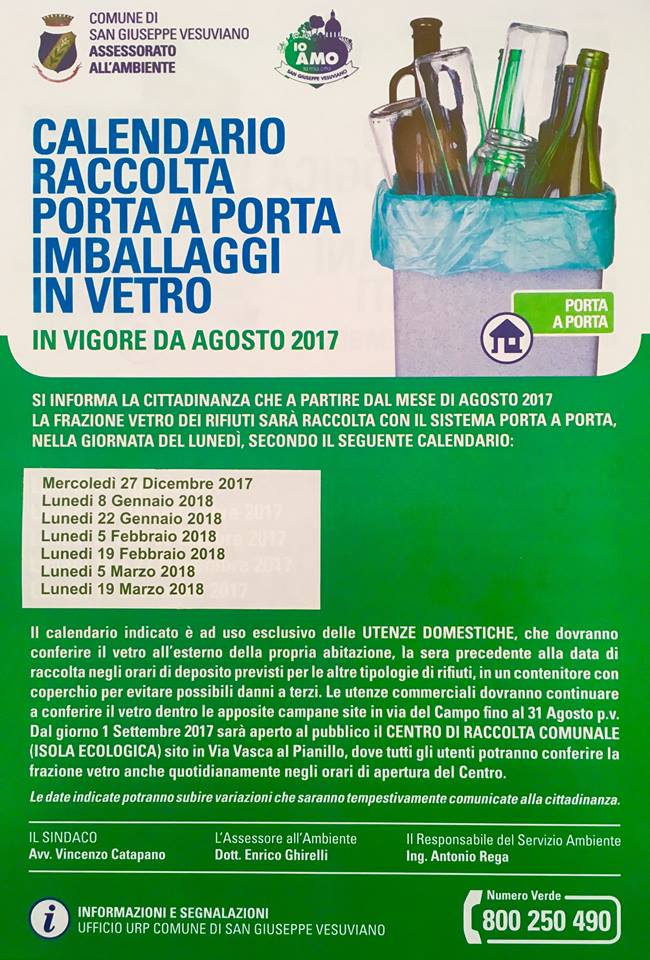 Dal 27 dicembre riparte, per le utenze domestiche, la raccolta del vetro porta a porta.